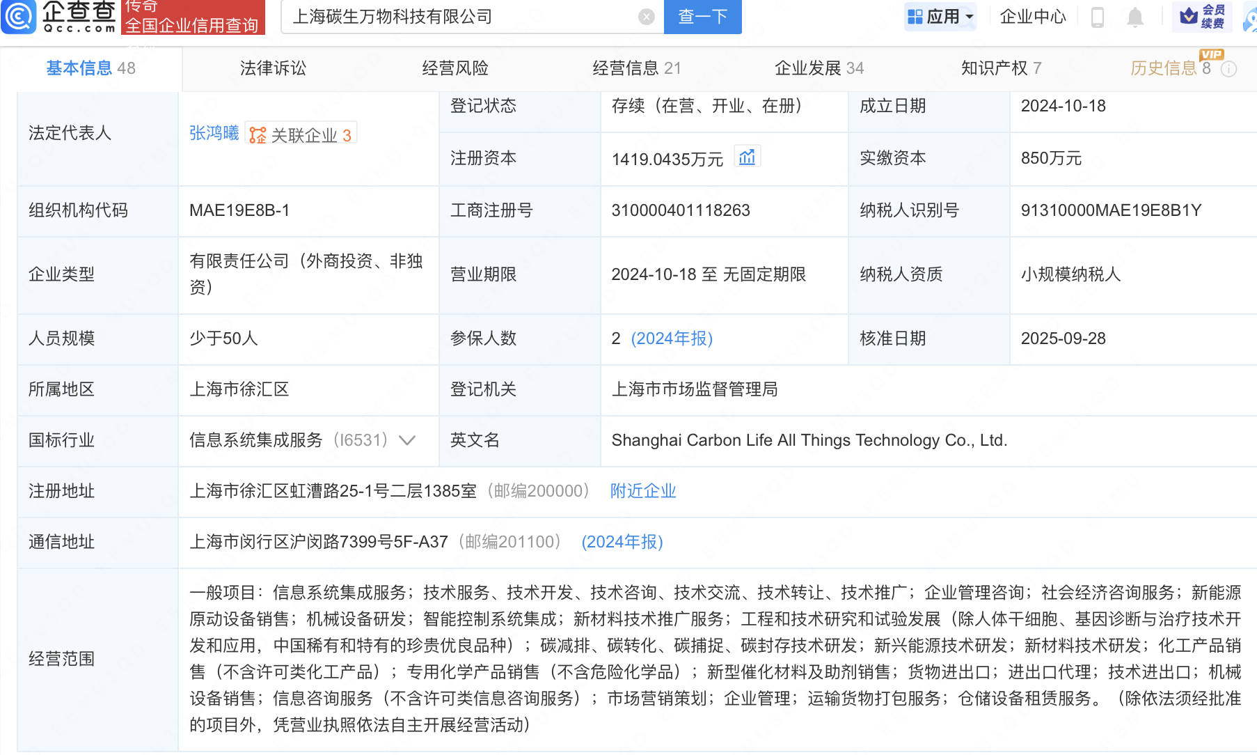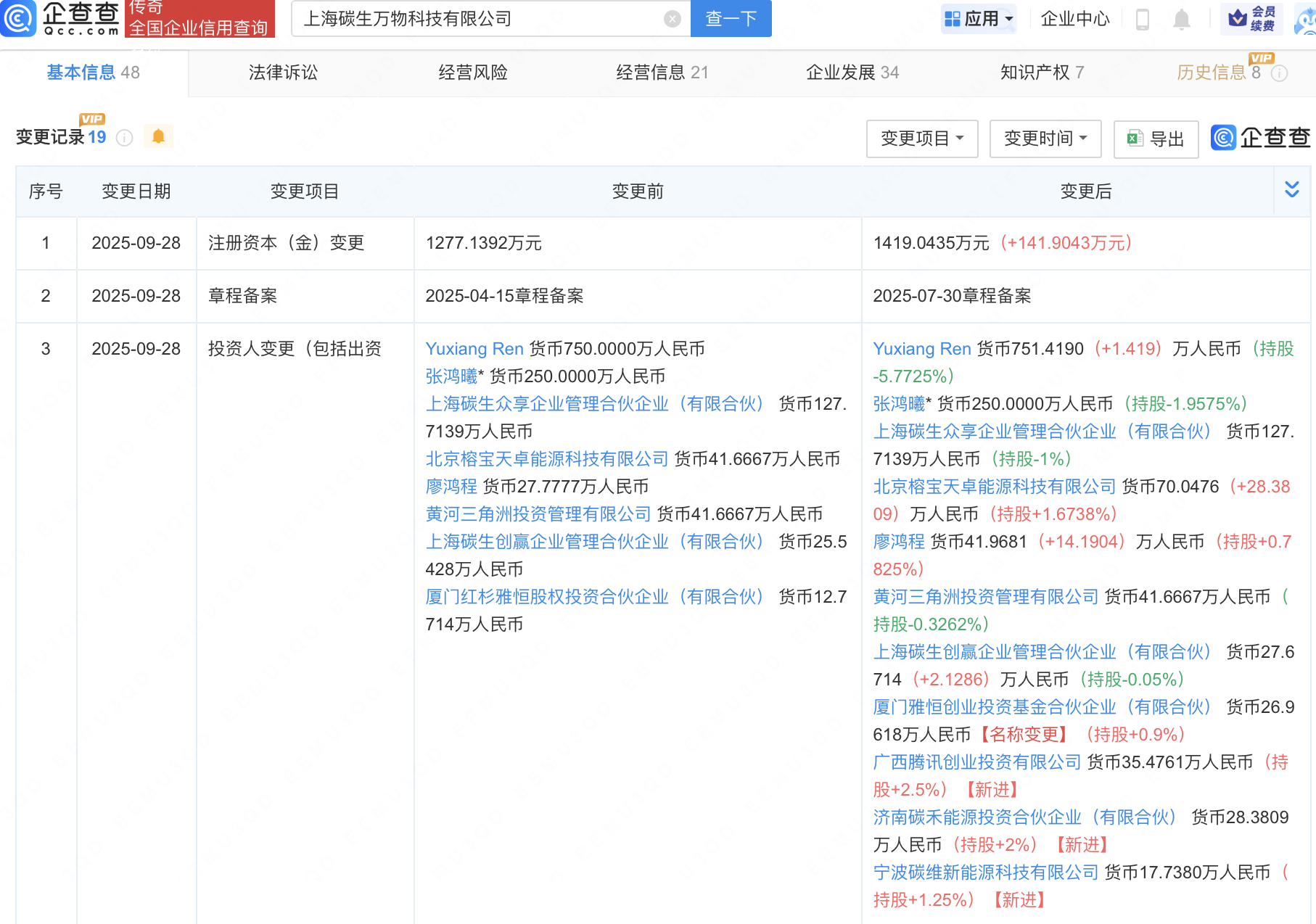 近日,上海碳生万物科技有限公司发生工商变更,新增广西腾讯创业投资有限公司等为股东,同时注册资本增至1419.04万元。企查查信息显示,该公司成立于2024年,经营范围包含:碳减排、碳转化、碳捕捉、碳封存技术研发;新兴能源技术研发等。公开信息显示,碳生万物聚焦碳科技与新材料领域创新应用,致力于为化工、能源行业提供清洁技术解决方案。
