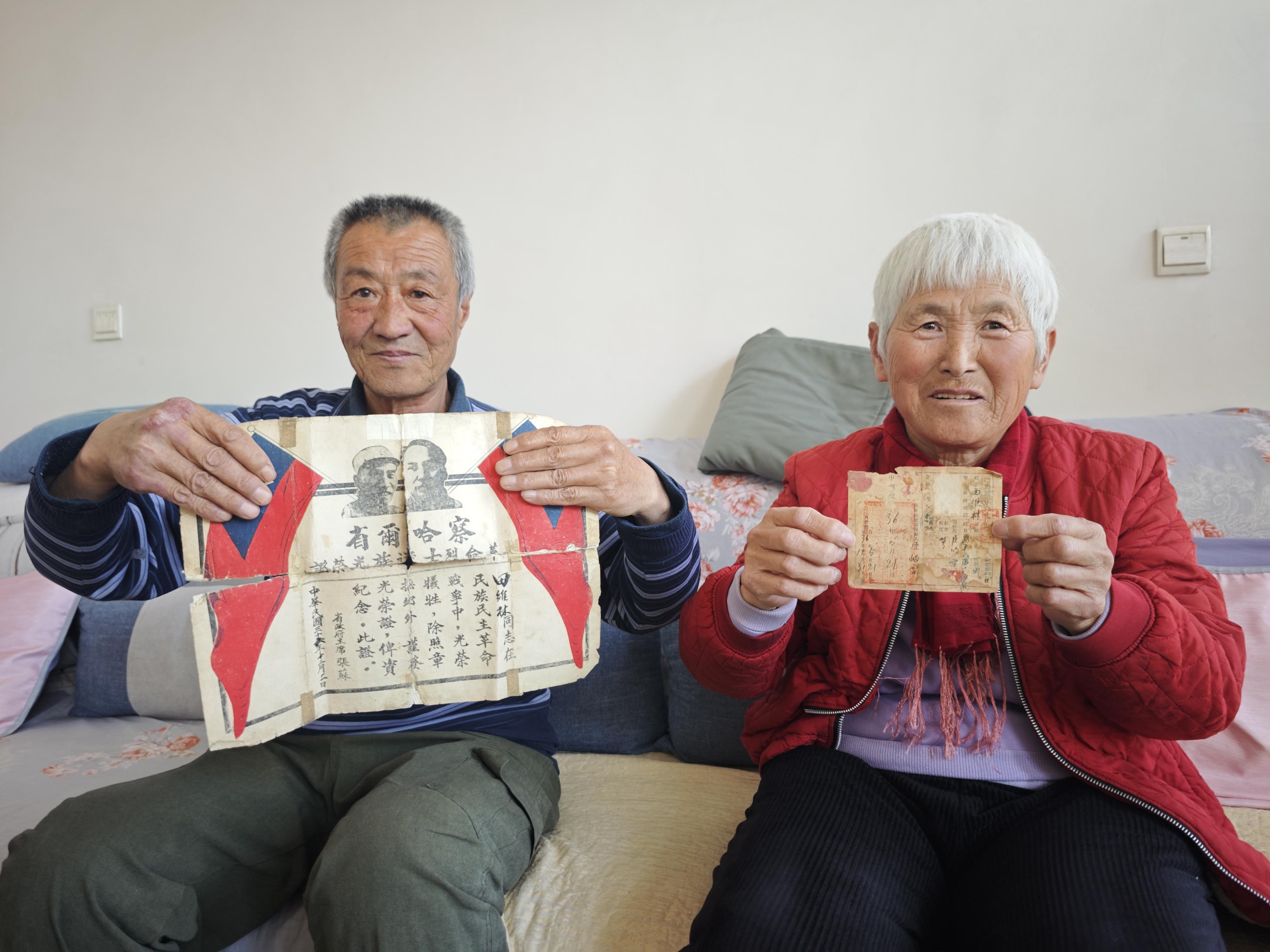 根据老人提供的线索,记者又和村委会工作人员来到田万学家走访。“没错,田维林是我二大爷。”田万学小心翼翼从柜子里取出烈士证,这张1947年由时任察哈尔省人民政府主席张苏签发的烈士证已经破损泛黄,部分字迹模糊,遍布着用胶带打的“补丁”。